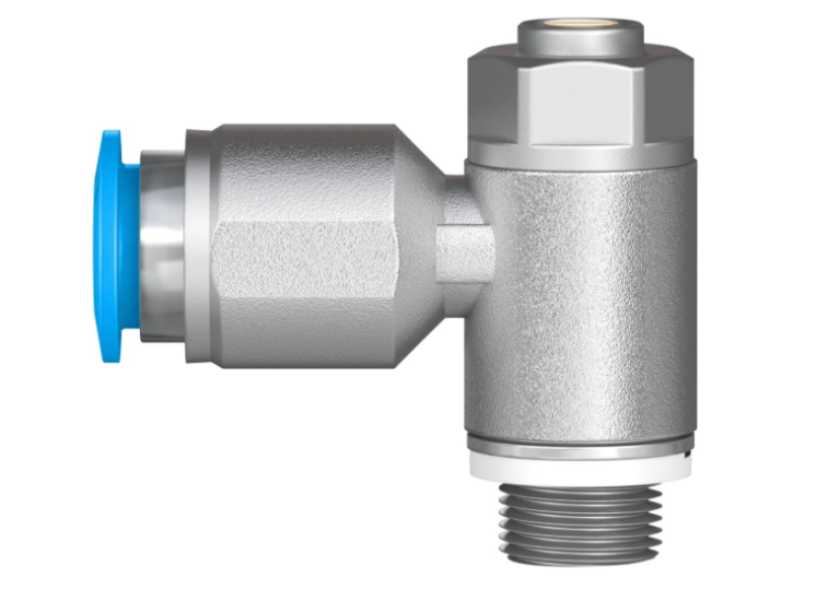 FESTO 193159 è un regolatore di portata unidirezionale modello GRLZ-1/8-QS-8-D per il controllo della velocità dei cilindri pneumatici durante avanzamento e ritorno.