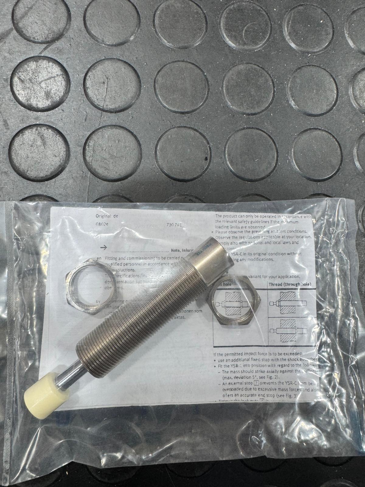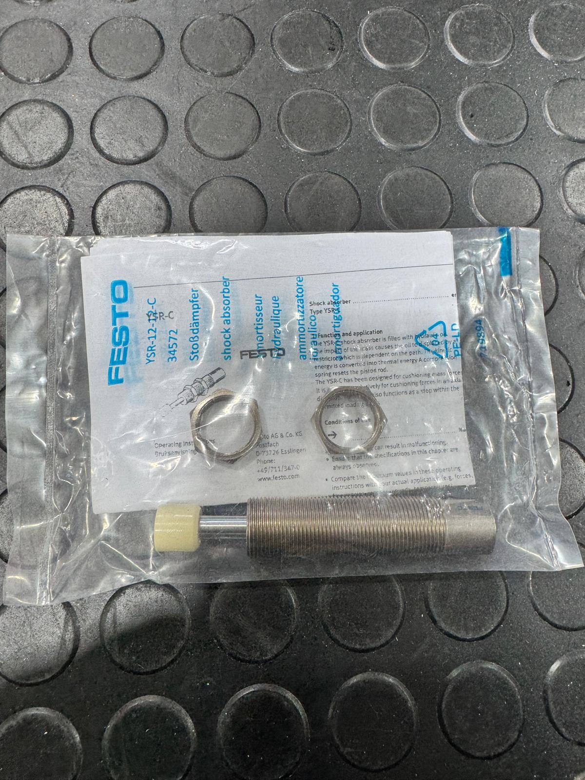 FESTO 34572 รจ un ammortizzatore idraulico auto-regolante YSR-12-12-C con corsa di 12 mm, progettato per assorbire energia cinetica in applicazioni pneumatiche e meccaniche industriali.